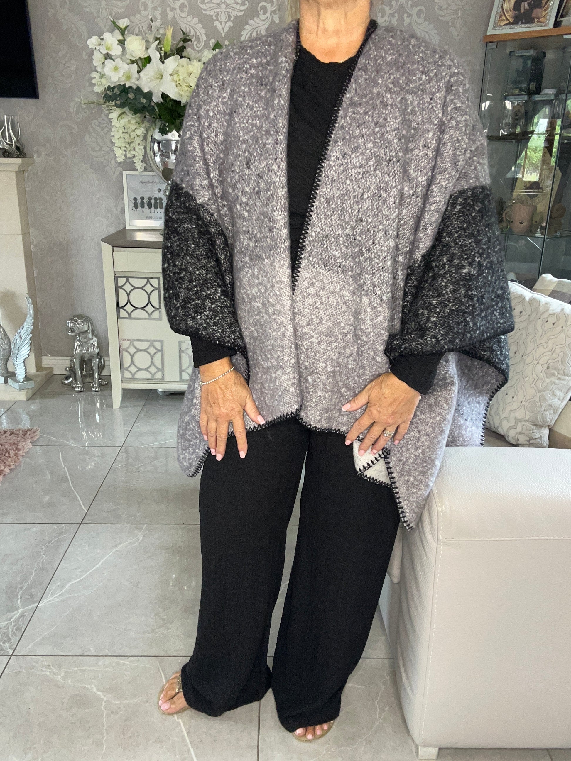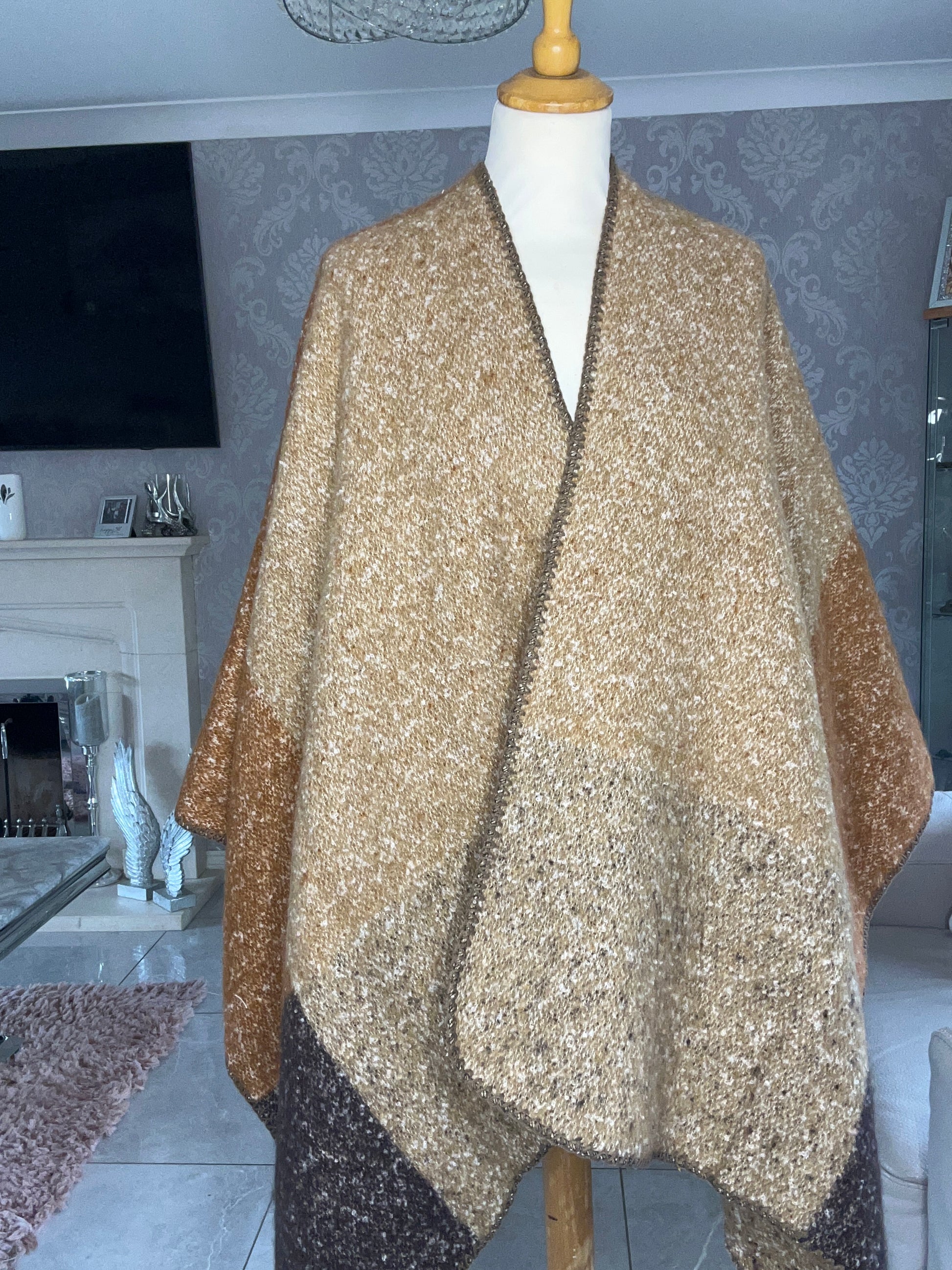 Embrace effortless elegance with our stunning wool wrap style cape. This beautiful piece combines contemporary style with timeless sophistication, featuring a unique patchwork design and charming blanket-style stitching around the edges that creates a cozy, artisanal feel.