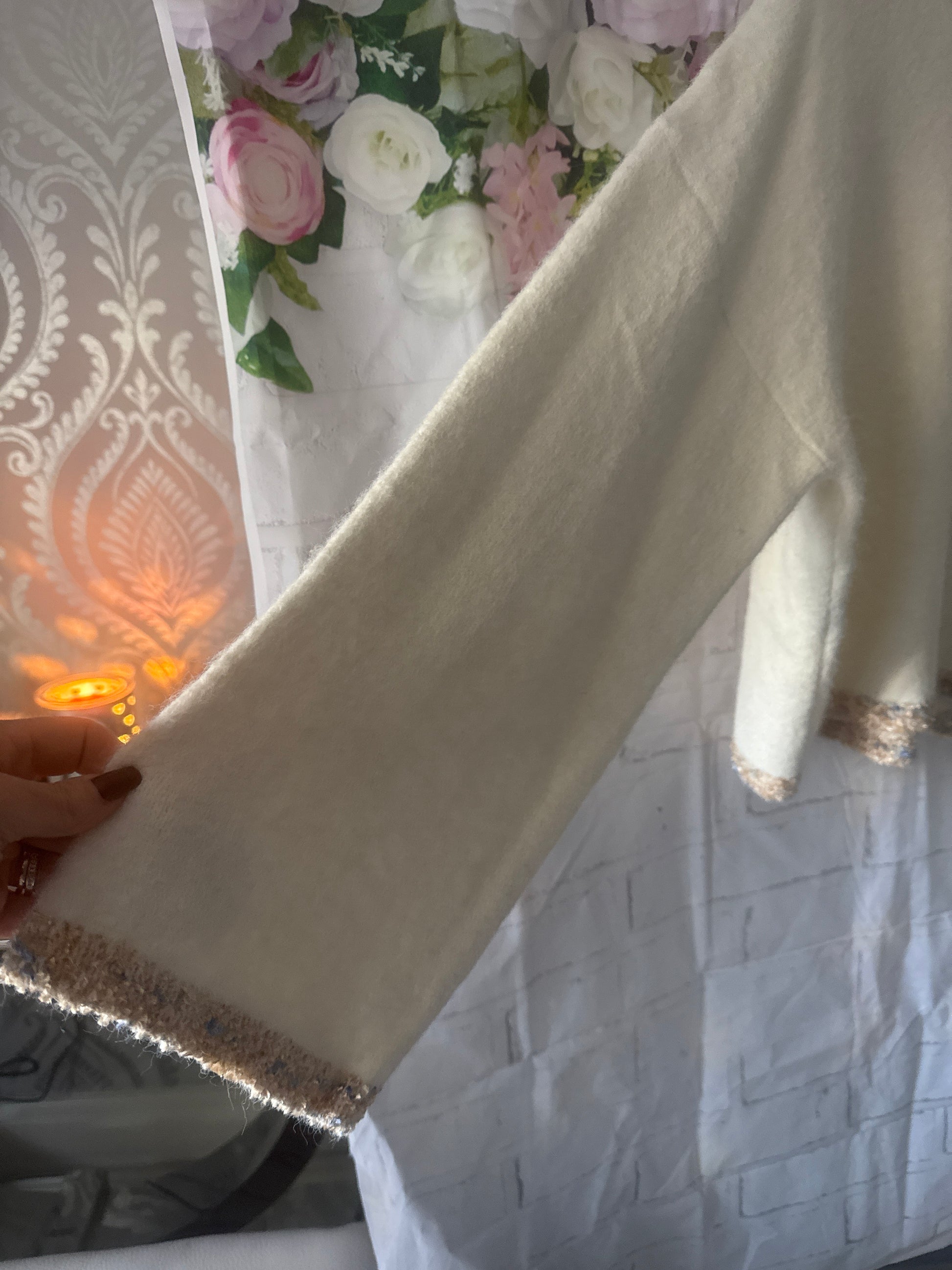 This soft knit jumper features a subtle silver effect on the neck, hem, and cuffs for an elegant touch. With its wide sleeves and one size that fits up to a size 20, it offers both style and comfort. Elevate your wardrobe with this versatile piece.