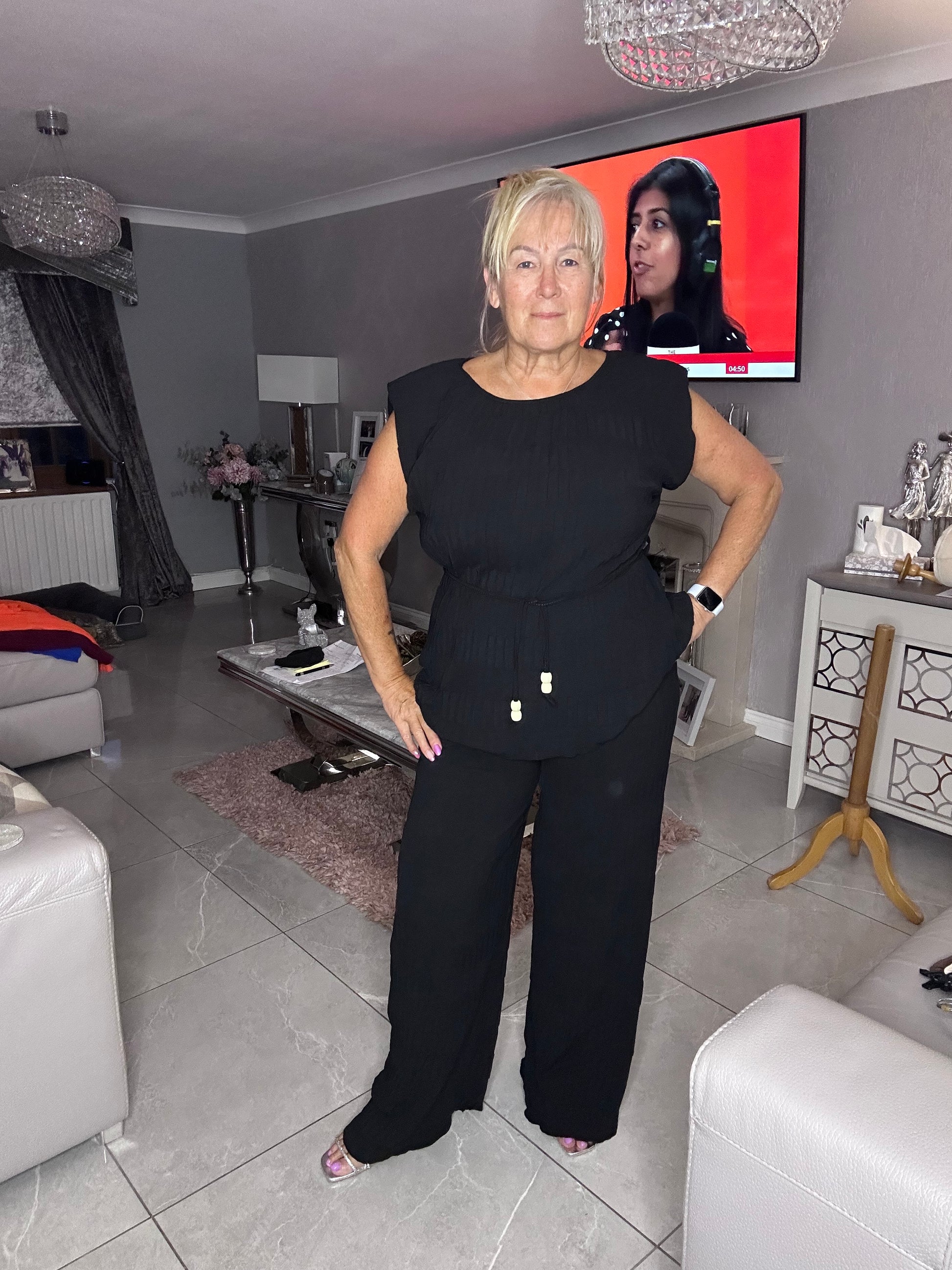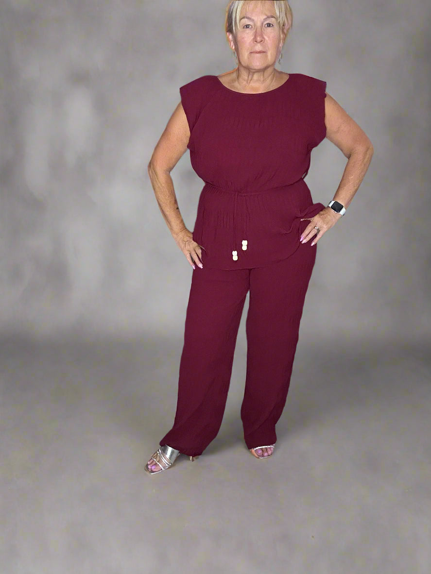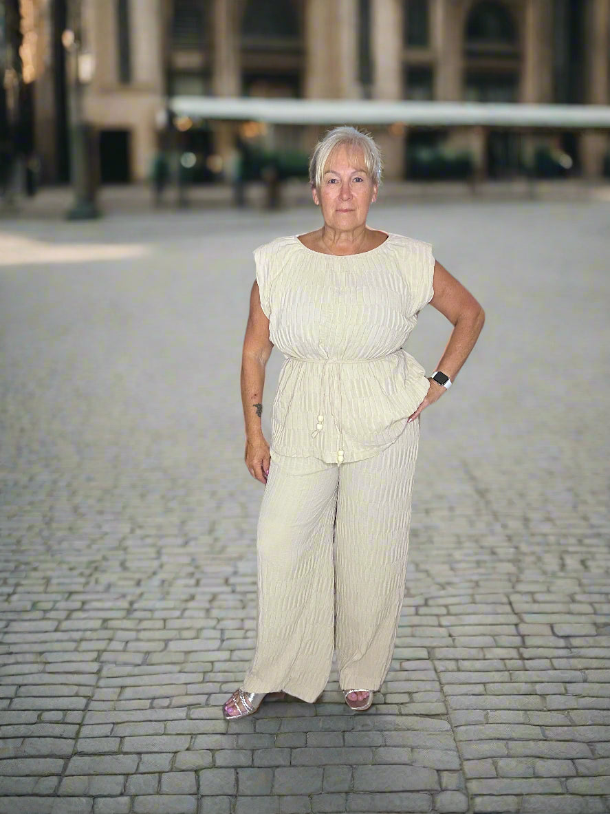 Discover the ultimate wardrobe essential with this stunning waffle pleat leisure suit. This versatile two-piece set combines effortless style with exceptional comfort, featuring a chic tie beaded belt and flattering design details that make it perfect for any occasion.